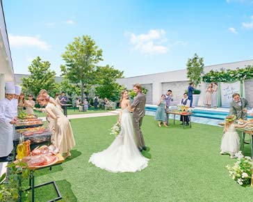 青く澄んだ空の下、爽やかな風を感じられるガーデンで自然体な表情が似合うリラックスムードの挙式。大切なペットと一緒に参加したり、好きなお花で彩るなどおふたりらしさを自由に演出できます。