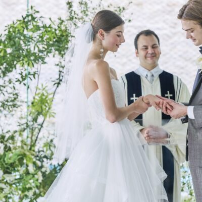 牧師が結婚式の進行を司り、神の前で生涯変わらぬ愛を約束し、その証として指輪交換する教会式は厳かな愛を誓うスタイルです。