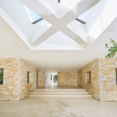 やさしい白と、温かみのあるレンガ壁が印象的なエントランス