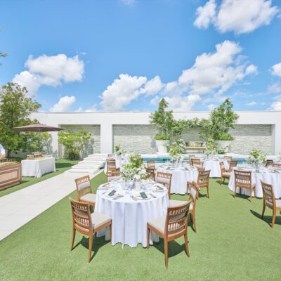ベンチやテーブルをセッティングした緑溢れる中庭。