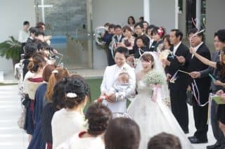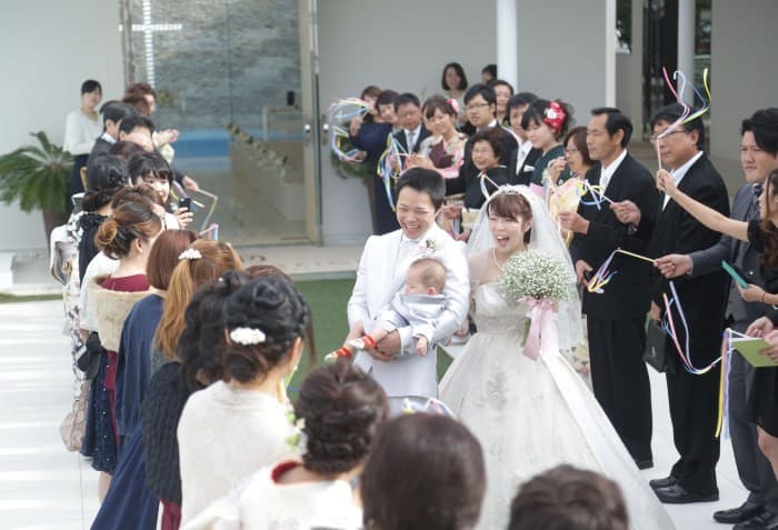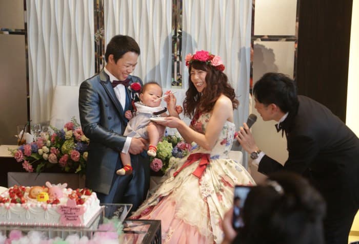 式当日は皆に楽しんでもらおうとお菓子まきをしました。 披露宴は息子と3人で入場する予定でしたが、眠ってしまったので臨機応変に対応してくれました。楽しみにしていたダミーケーキも、ド派手に転んでくれて最高でした。当日はあっという間に過ぎてしまいましたが、本当に最高の結婚式が出来たと思います。 ふたりではできなかった結婚式を一緒に創ってくれた真子ちゃん、スタッフの皆に感謝です!!ありがとう。