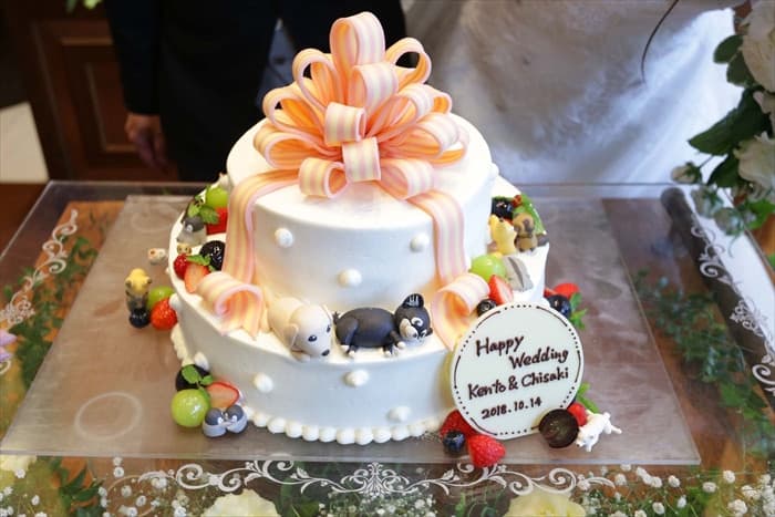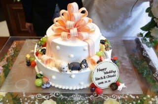 ウエディングケーキは、動物が大好きな私たちらしく、たくさんの動物たちがあしらわれたファンシーなケーキを作っていただきました。基本の形からデコレーション、色使いなどとても細かな希望まで聞いてくださり、実際に出来上がったケーキは私たちの想像を超える素敵な仕上がりに感動しました。新郎の実家で飼っている犬を砂糖菓子で表現してくれたのも家族に好評でした。