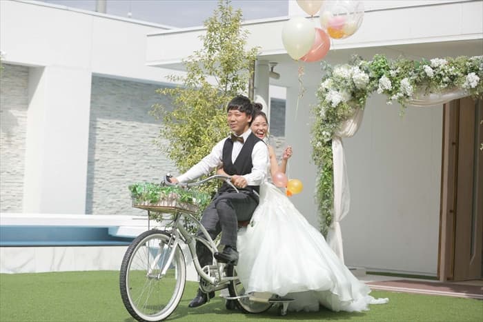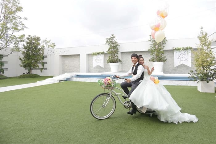 結婚式の当日は、あまりに幸せすぎてあっという間に時間が過ぎてしまいました。特に気に入っている演出は、お色直しにタンデムクルーザーでの入場です。もともと新婦は恥ずかしがっていたのですが、かわいい新婦の姿をみんなに見てもらいたいという新郎の願いと、丸ちゃんのおすすめもあり、実現したものです。タンデムクルーザーに乗っている時は漕ぐことに精一杯でしたが、後で友人からもらった、ポップでかわいらしい写真を見た時、やってよかったなあと思いました。