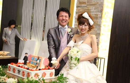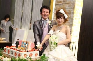 「長年私達を見守ってくれたゲストの方々にも楽しんでもらえる式にしたい!」という強い想いだけはあったものの、全くのノープランで挑んだ打合せ。2人で息詰まることもあったけど、いつも担当プランナーのベイブさんが、一緒に悩み、考え、私達好みのステキな提案をしてくれました。おかげで、私達が通った高校校舎のウエディングケーキや、新郎の超ロングコック帽でのメニュー紹介、そして1番こだわった、寸劇風のリメイク入場 etc・・・ とにかく盛りだくさんの内容になりました。後日、たくさんのゲストから「楽しかった」「良い式だったよ」「今まで見た式の中で1番良かったよ」と言って頂き、私達もとても満足しています。