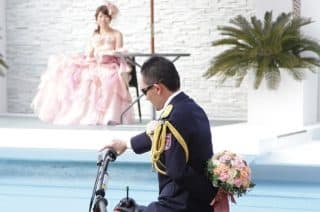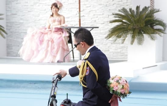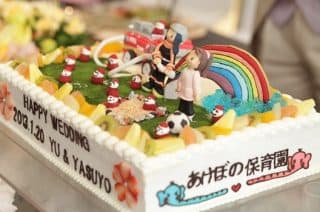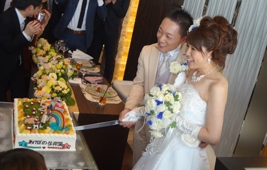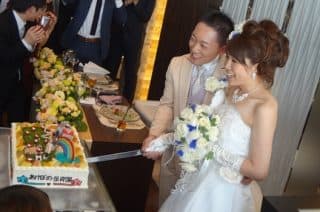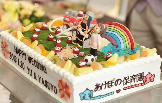 消防士と保育士なので、職業をテーマにしたウェディングケーキ、挙式には子ども達がいっぱい、余興は体育会系、なぜか新郎が裸になる…(笑)そんな無茶もブラン・ベージュだから出来たことです。一番の見せ場 はリメイク入場、バイクに乗ってプロポーズ大作戦。綺麗なガーデンをステージに、お姫様だっこして入場した時に100名からの拍手は圧巻!!だいぶノロケました(笑)