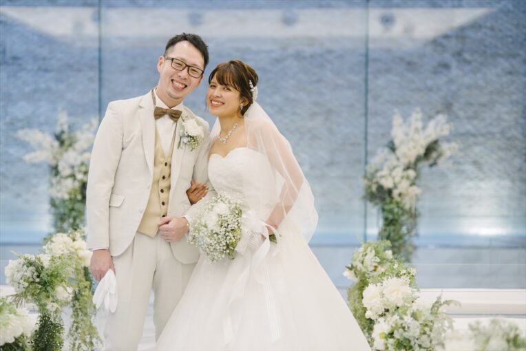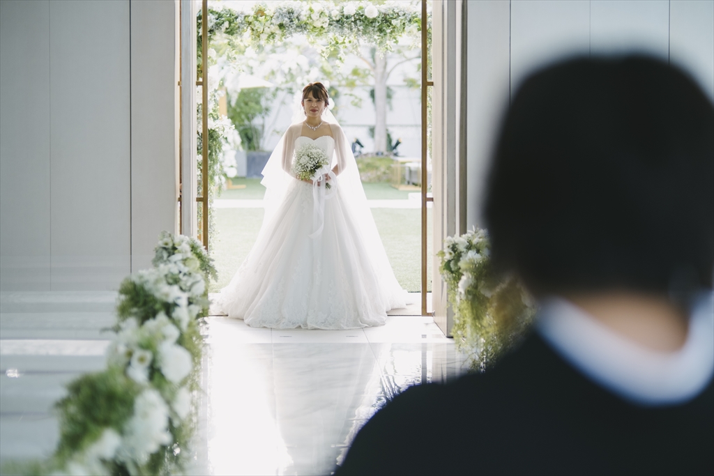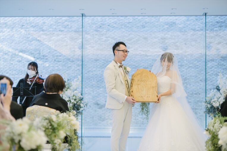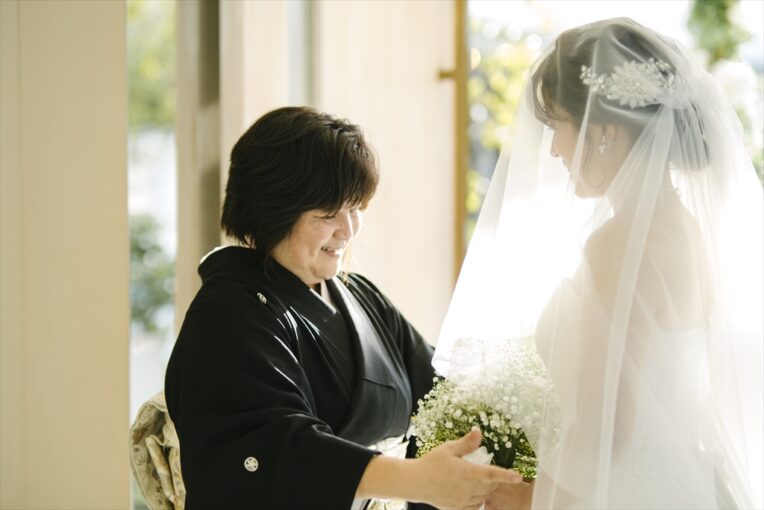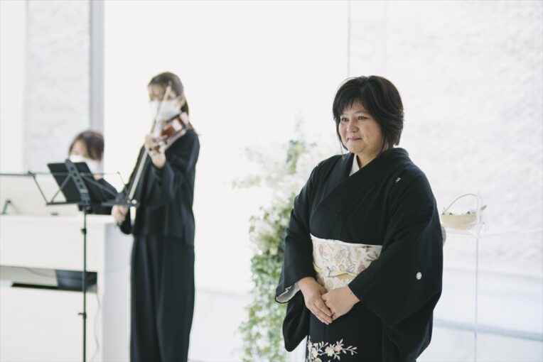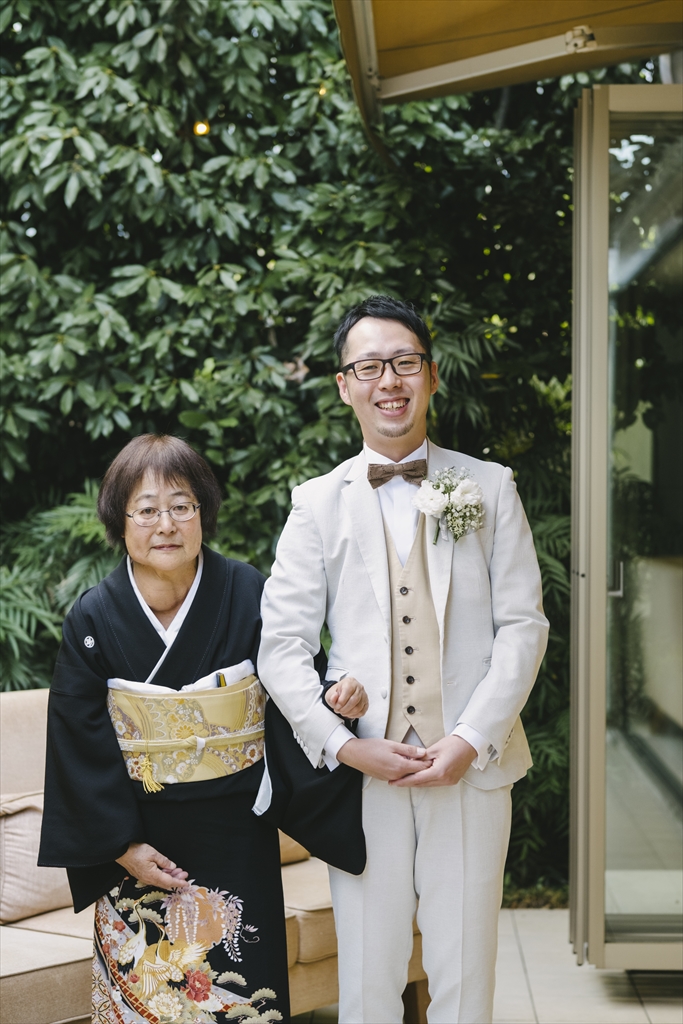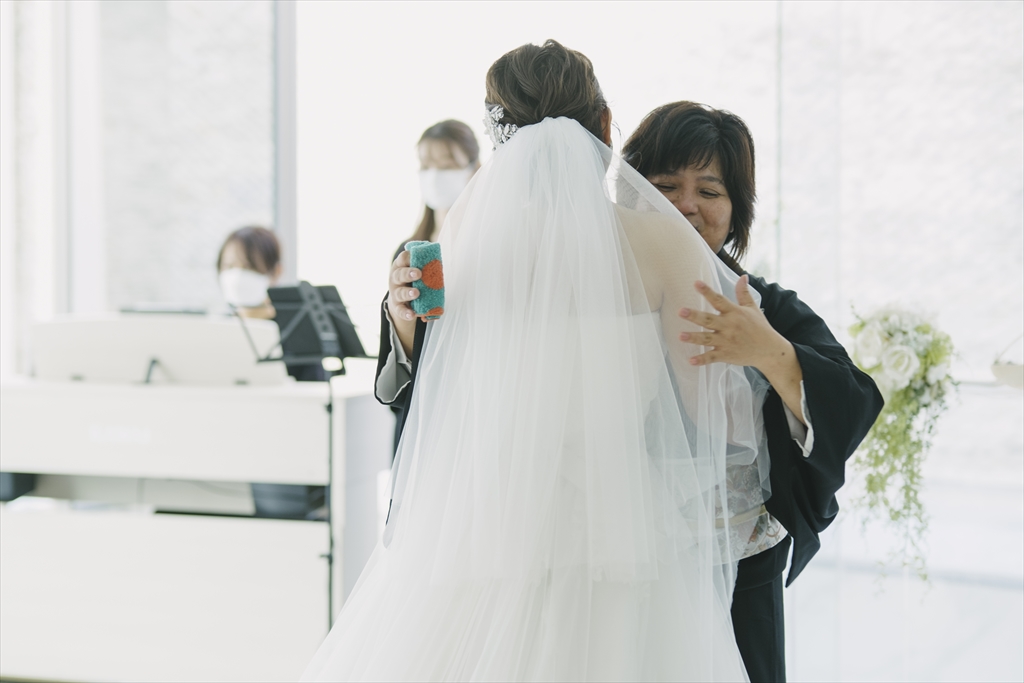 挙式までのお時間はそれぞれのご家族と過ごしました。めいさんはお母さまに感謝の気持ちをしっかりと届けます。さらにこの日は、挙式の演奏にめいさんの学生時代の後輩であるゲストも参加をしてくださり、涙涙のご対面となりました。しんじさんは着々と来館されるゲストの皆さんを待合室でお出迎えしてくださいました。