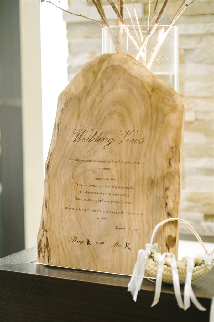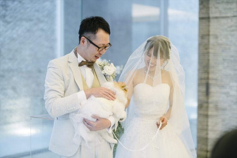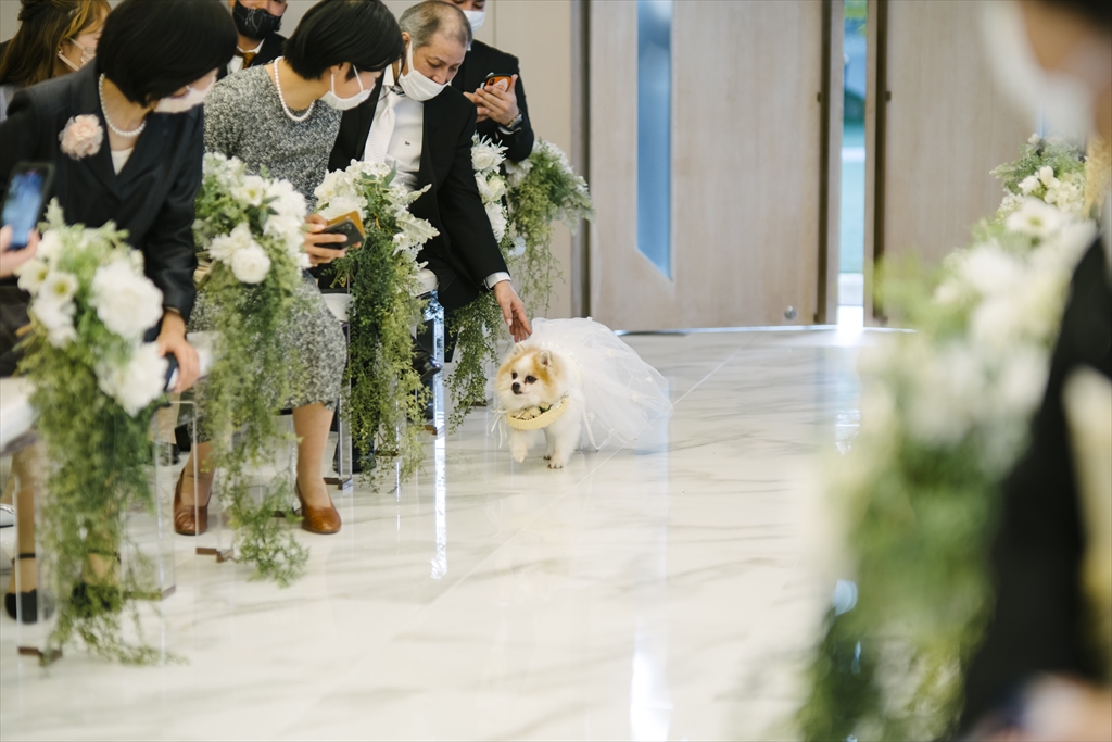 ゲストの皆さまを証人として、愛を誓う人前式。挙式の入場でおふたりはファーストミートを迎えます。愛犬のまおちゃんも指輪を運ぶ為に参加してくれ、可愛らしい姿をゲストにもお披露目していただきます♪手作りの結婚証明書がとっても素敵でした。