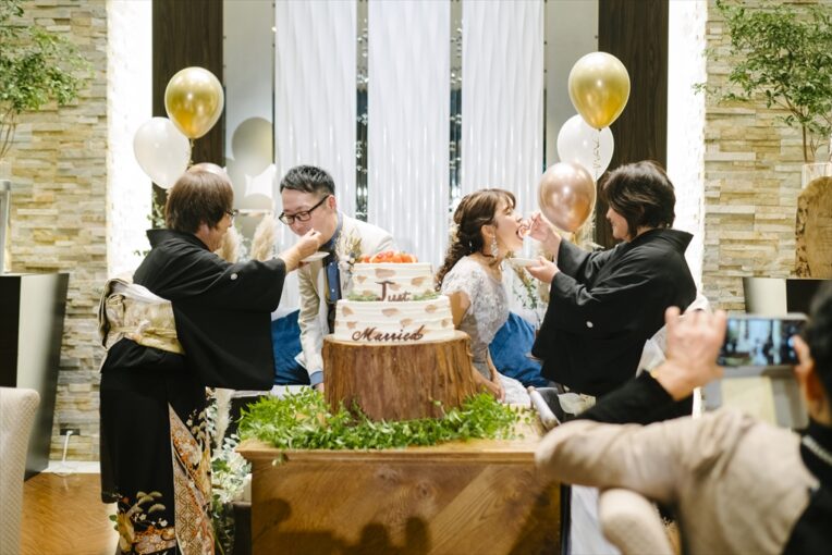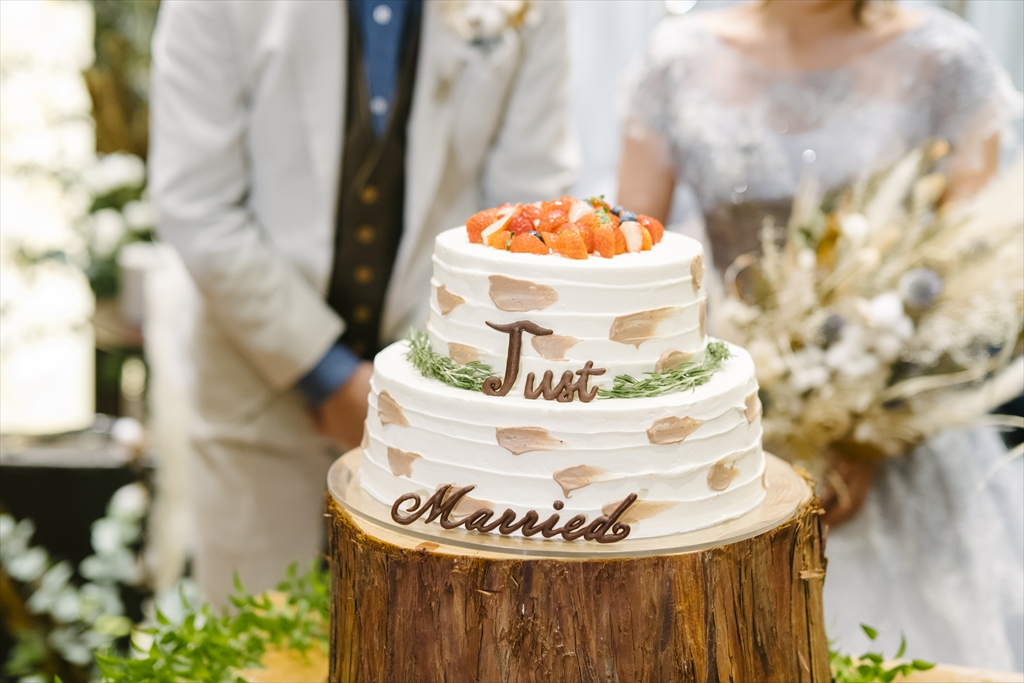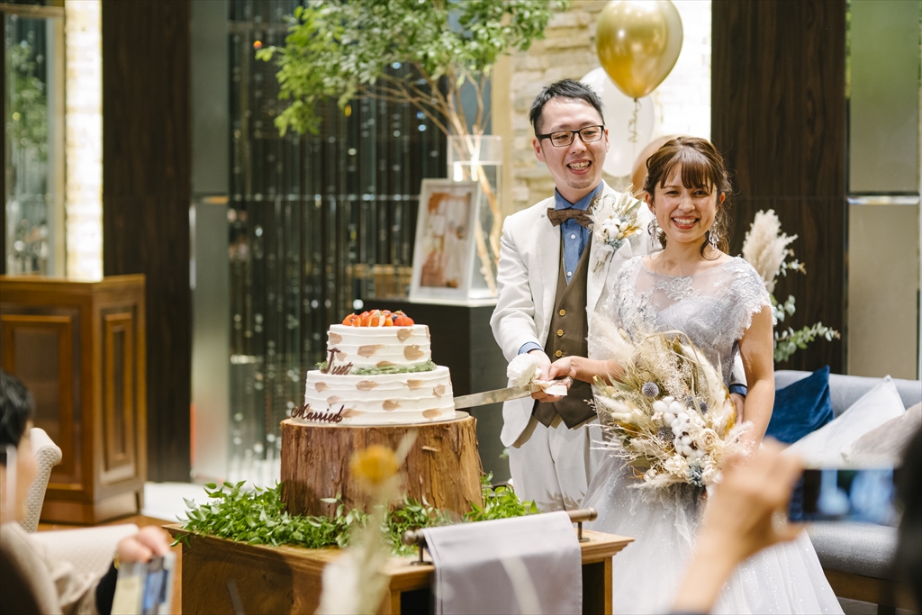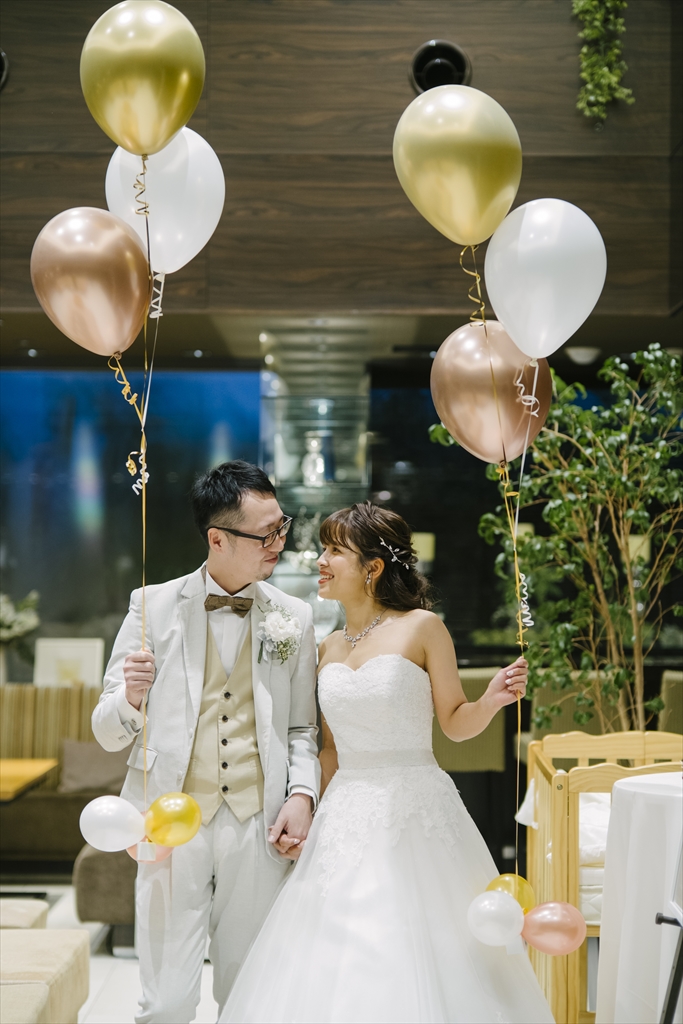 あっという間に披露宴もスタート!バルーンをもったおふたりの入場は、ゲストも一緒になって盛り上げてくださいました!秋を感じられる木の実やドライフラワーを使った高砂がおしゃれに彩ります♪