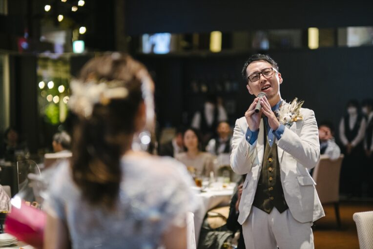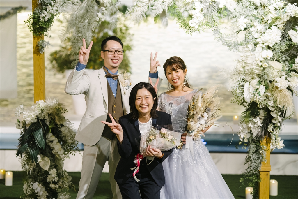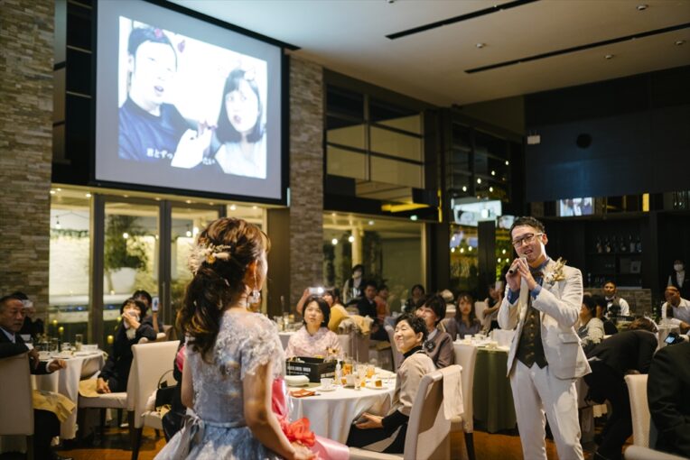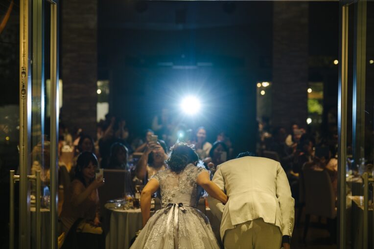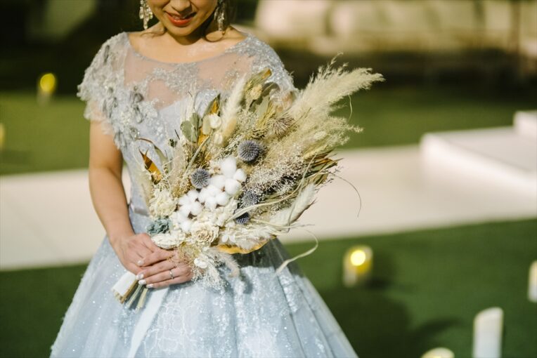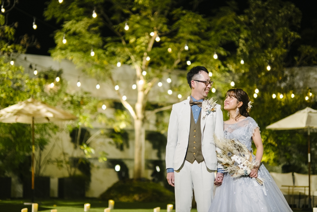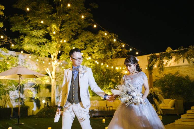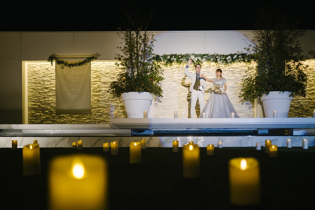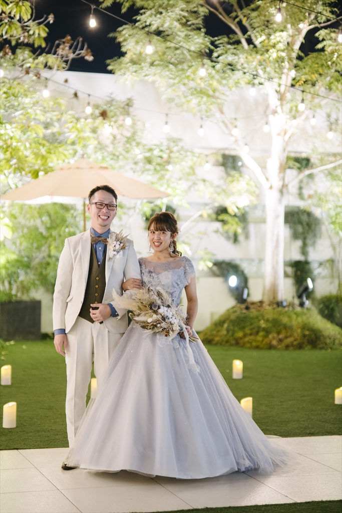 「一目惚れすぎた」というカラードレスに1秒でも早く着替えたい!というおふたりのご希望で、この日は後半のお色直し後にたくさんの時間をとれるように。キャンドルが煌く中、ガーデンからカラードレスにお色直ししたおふたりが登場すると、会場からも歓声があがります!