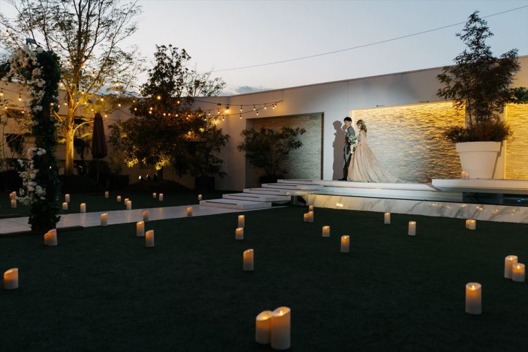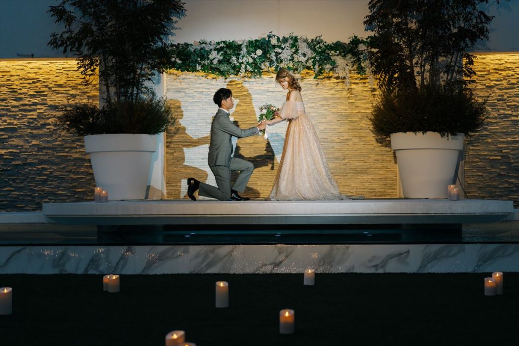 結婚式情報サイトに載っていたブランベージュを見て、ブライダルフェアに申し込みました。実際に見学へ行くと、きらきらと輝く水面に囲まれたガラスのチャペルや、パーティ会場から続く緑いっぱいのガーデンも素敵だなと思いました。特にナイトガーデンの雰囲気がとても気に入り、ブランベージュに決定しました。