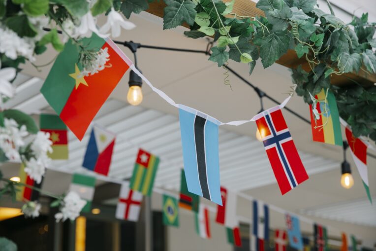 カーテンOPENで見えてきたのは、懐かしの国旗ガーランド。ゲスト全員、体を動かす時間の始まりです!