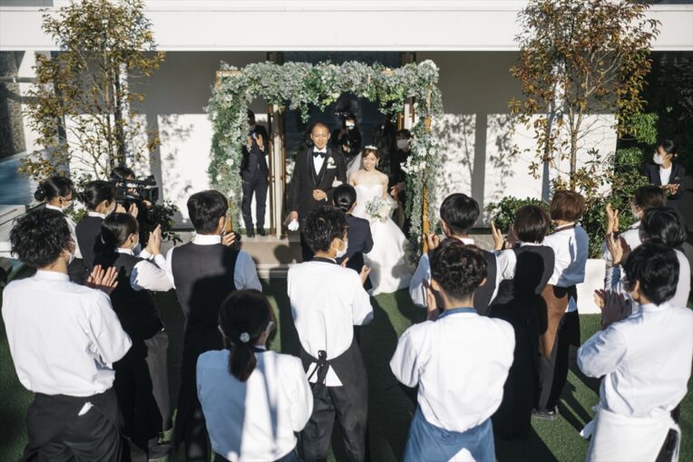 数年前までは新郎新婦を迎える立場だった新婦さきさんですが、この日は待望のブラス花嫁になる日!という事でスタッフとのサプライズ対面や、キャンドルが並ぶロマンチックなガーデンからの入場など、さきさんがブランベージュでアルバイトをされていた頃からの夢を叶える事が出来た1日となりました!さきさんのご要望もしっかり受け止め、一緒におふたりらしい結婚式を考えてくださったよしみちさんもフランベパフォーマンスなど様々な演出で、結婚式を盛り上げてくださいました。おふたりだからこそ出来た演出や、心温まるお時間が沢山ありました。