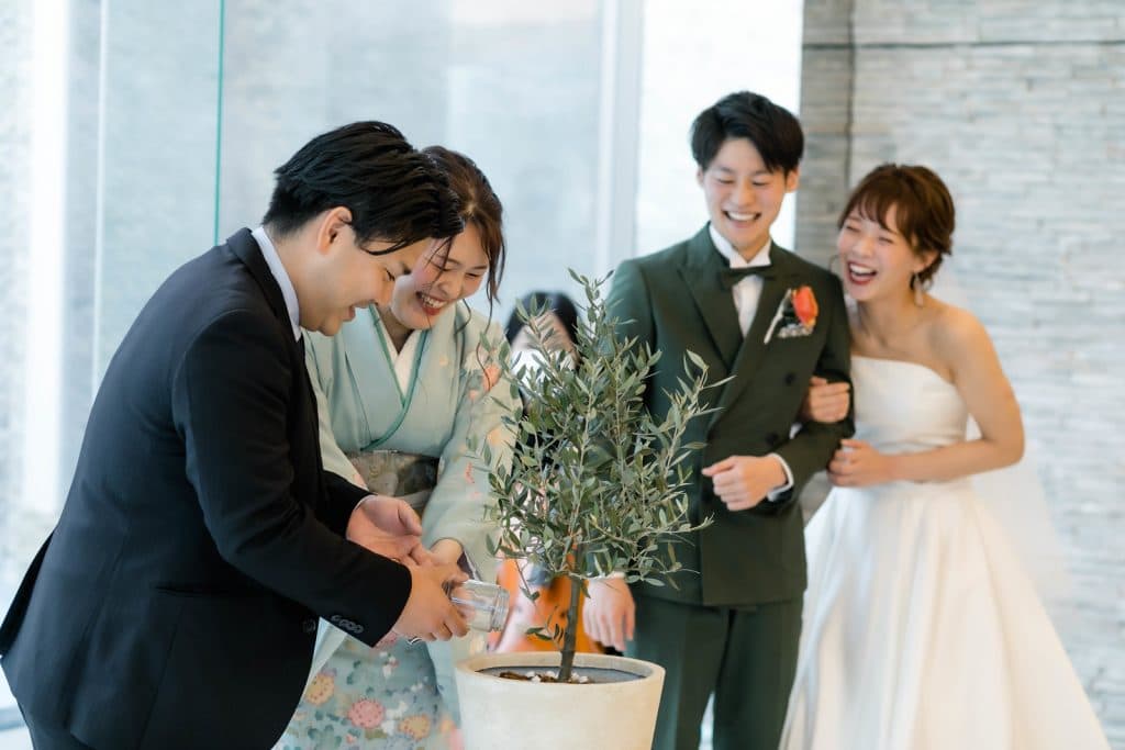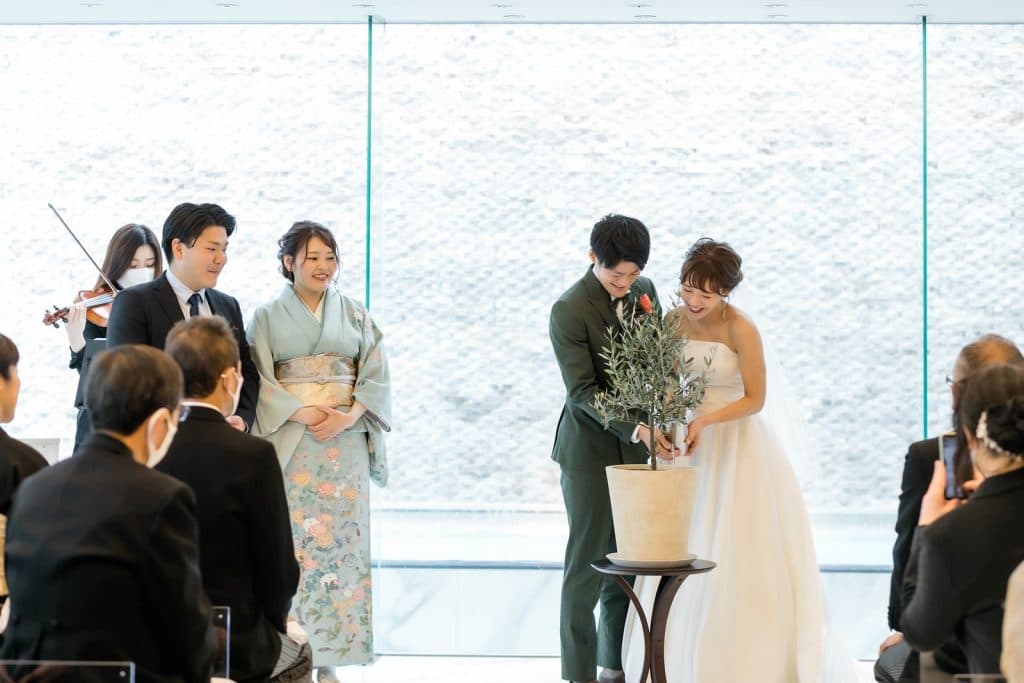 挙式では、ゲストにご参加いただきオリーブの植樹式を行いました。お付き合いを始めるきっかけとなったご友人夫妻にもサプライズでご登場いただくなど、大切な皆様と創り上げた温かいお時間となりました。