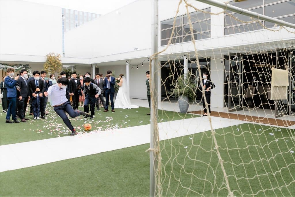 またアフターセレモニーでは、ガーデンに「デザート」と書かれたパネル付のサッカーゴールを用意し、見事そのパネルを当てた方には披露宴にて豪華なデザートをプレゼント!といったユニークなイベントを開催し、大盛り上がりでしたね!