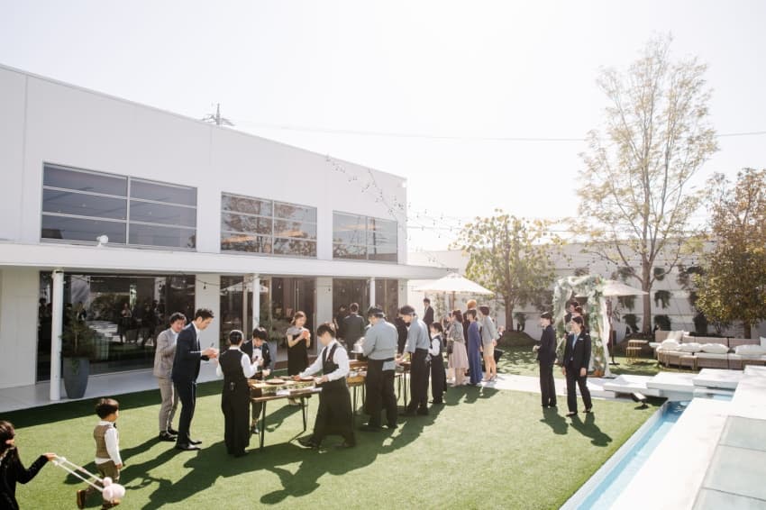 ビュッフェタイムもガーデンで行うことができ、ゲスト想いのおふたりらしい、楽しくアットホームな時間。