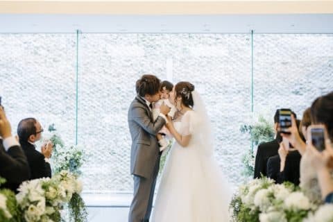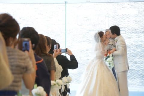 挙式ではリングキッズや、お子さまの頬へ誓いのキスの演出。